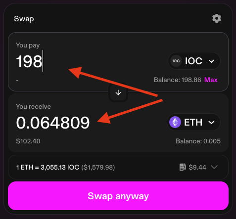 Now you can enter the amount of IOC Token that you wish to trade for the ETH. Enter the amount of IOC Tokens that you would like to sell in the top box to see the amount of ETH that you should get once the trade happens. When there is low liquidity, there may be a % loss on top of the amount you're looking to trade to be careful.