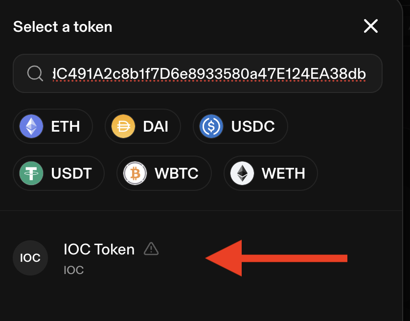 <figure><img src="https://2824543476-files.gitbook.io/~/files/v0/b/gitbook-x-prod.appspot.com/o/spaces%2F8fZNM0zT91xiFAIYAPwM%2Fuploads%2F3tUSdlefxWZPgEerJBzt%2FScreenshot%202023-10-16%20at%2016.44.05.png?alt=media&#x26;token=de6b6fd2-ede7-452c-b58a-43927e7083f2" alt="" width="375"><figcaption><p>Selecting the IOC Token</p></figcaption></figure>