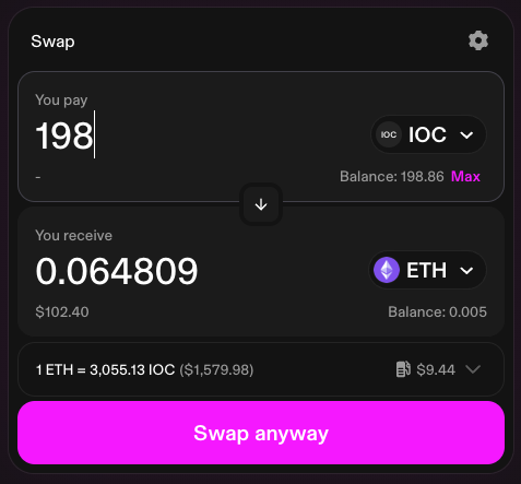 Click 'Swap' followed by 'Confirm swap' if you are happy with the transaction. Congratulations, you have successfully traded your IOC Tokens for ETH.
