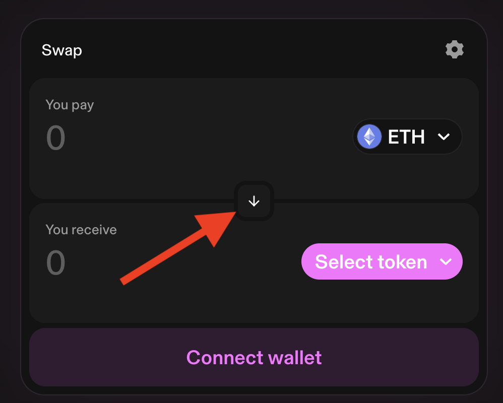 Now you should be able to see a screen that looks like this. This is found under the 'SWAP' tab at the top left of the Uniswap screen. Make sure you click on the arrow in the middle to swap the asstes over. ETH needs to be on the bottom